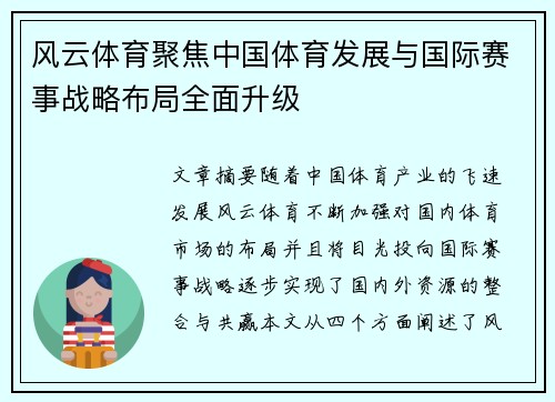 文章摘要:随着中国体育产业的飞速发展,风云体育不断加强对国内体育市场的布局,并且将目光投向国际赛事战略,逐步实现了国内外资源的整合与共赢。本文从四个方面阐述了风云体育如何聚焦中国体育发展和国际赛事战略布局的全面升级。首先,文章分析了风云体育在推动国内体育事业的持续发展的关键措施。其次,探讨了风云体育如何通过赛事举办、版权合作等形式提升其国际竞争力。再次,分析了风云体育在促进中国体育品牌走向国际市场方面的战略布局。最后,文章总结了风云体育未来在中国体育产业和国际赛事发展中的潜力和挑战。通过这些内容,本文旨在揭示风云体育如何引领中国体育行业向全球化发展迈进。